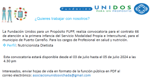 La FUNDACION UNIDOS PARA UN PROPOSITO, invita a todas las personas del territorio nacional, en especial a las residentes en el departamento de VICHADA, municipio de PUERTO CARREÑO a participar de la convocatoria pública para la ejecución DEL SERVICIO JARDIN INTERCULTURAL DE EDUCACION INICIAL en dicho departamento, y que cumplan con los requisitos dispuestos en la presente convocatoria, a postularse a cualquiera de los cargos según aplique su perfil, enviando su hoja de vida con soportes al correo: unidospropiavichada@gmail.com, se estarán recepcionando las hojas de vida del 10 de Febrero a las 8:00 a.m., hasta el día 13 de Febrero a las 2:00pm.