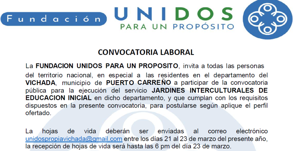 La hojas de vida deberán ser enviadas al correo electrónico unidospropiavichada@gmail.com entre los días 21 al 23 de marzo del presente año, la recepción de hojas de vida será hasta las 6 pm del día 23 de marzo.
